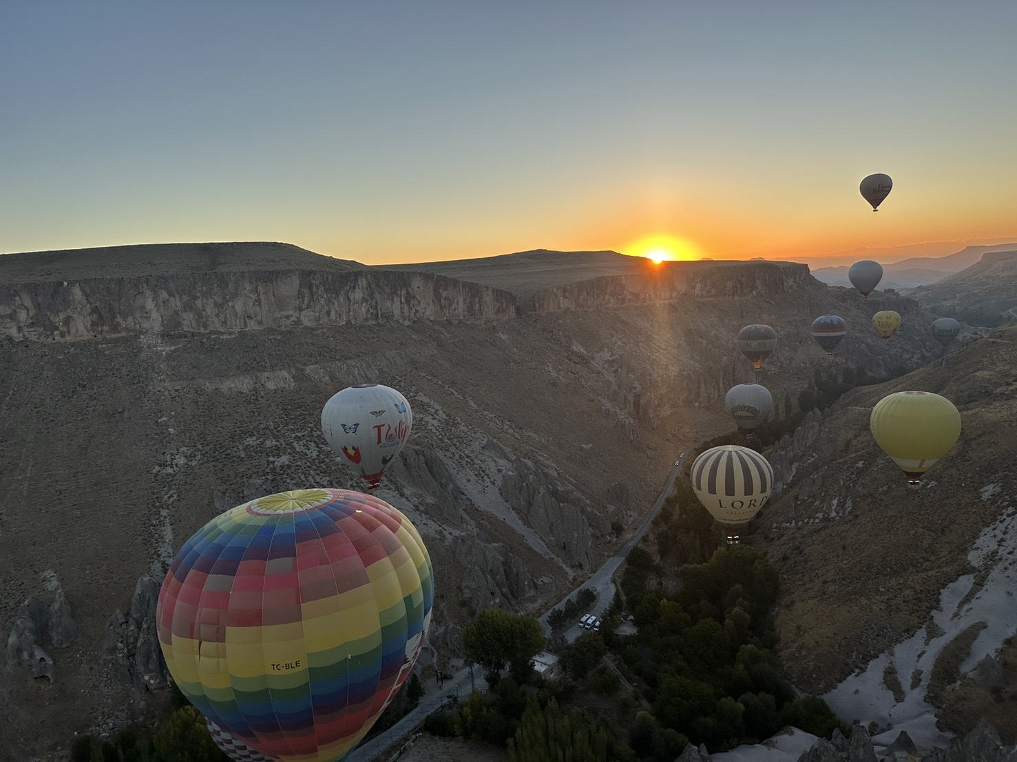 トルコ・カッパドキアの夜明け。 谷間からゆっくりと昇る朝日とともに、色とりどりの気球が静かに空へ舞い上がります。 地上の岩肌に映る柔らかな光、気球のシルエット、そして刻一刻と変化する空のグラデーション。 自然と人の営みが溶け合うような、幻想的な時間が流れます。