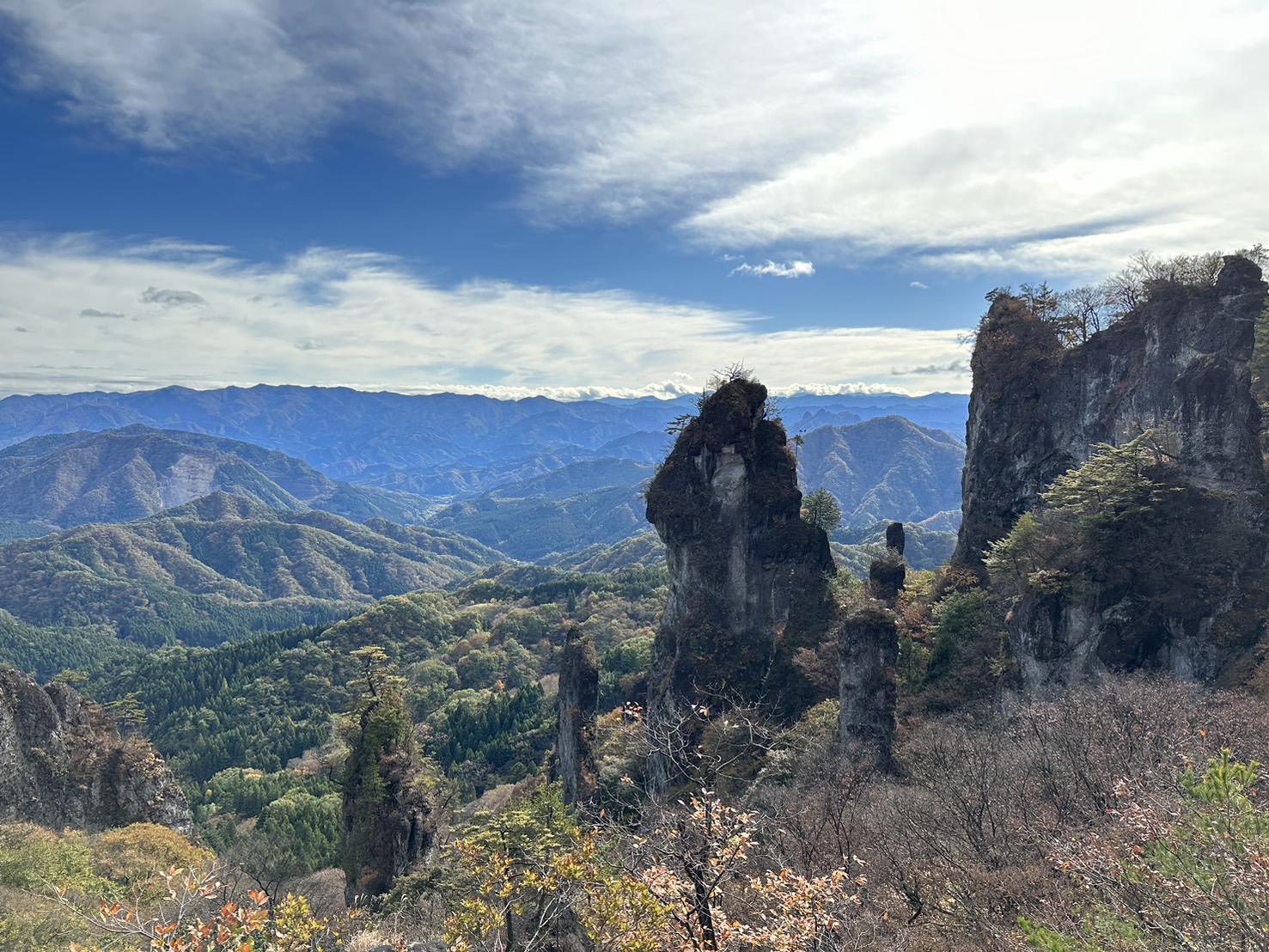 群馬県にそびえる「妙義山」は、日本三大奇勝のひとつに数えられる名山です。独特の形をした奇岩や絶壁が連なり、迫力ある山容が訪れる人々を魅了します。秋には紅葉が山全体を彩り、岩峰群とのコントラストが美しい景観を生み出します。登山やハイキングの名所として知られ、展望台からは関東平野を一望できる絶景スポットです。