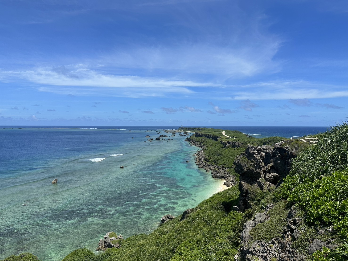 沖縄・宮古島の最東端に位置する「東平安名崎(ひがしへんなざき)」。約2kmにわたって細長く突き出した岬は、両側を美しい海に囲まれた絶景スポットです。コバルトブルーとエメラルドグリーンが織りなす海のグラデーション、岬の先端に建つ灯台がシンボルとなり、宮古島観光では欠かせない名所です。日本の都市公園百景にも選ばれています。