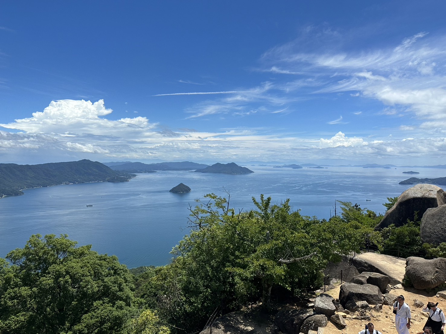 世界遺産・厳島神社で知られる宮島。その最高峰「弥山(みせん)」からの眺望は、瀬戸内海の多島美を一望できる絶景スポットです。大小さまざまな島々が点在する穏やかな海と、広がる青空のコントラストは訪れる人々を魅了します。ロープウェーを利用して山頂付近まで登ることができ、ハイキングや観光の人気コースとして知られています。