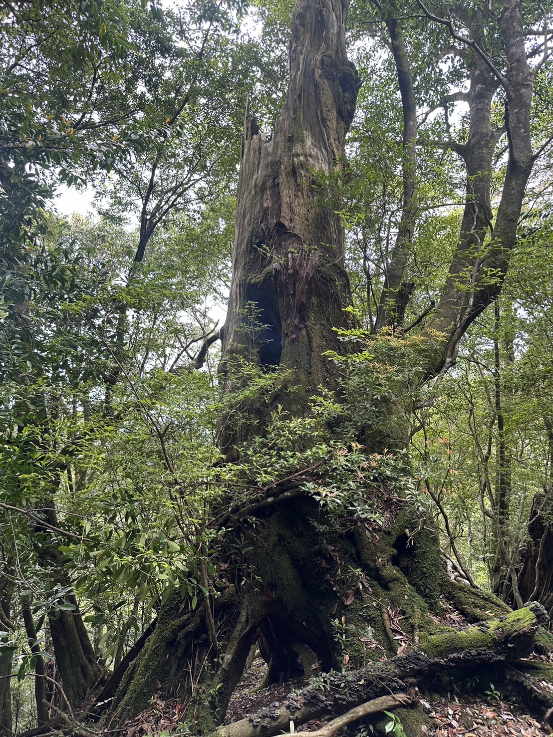 世界自然遺産・屋久島に佇む屋久杉の巨木。幹の一部は朽ちて空洞となりながらも、今なお力強く枝葉を伸ばす姿は大自然の生命力を感じさせます。数百年から数千年という長い年月を生き抜いてきた屋久杉は、苔や新緑とともに独特の神秘的な景観を作り出し、訪れる人々に深い感動を与えます。