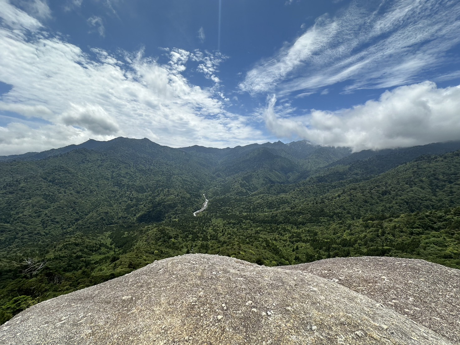 屋久島・白谷雲水峡の奥に位置する「太鼓岩」。巨大な花崗岩の上からは、宮之浦岳をはじめとする屋久島の山々と広大な森を一望できます。晴れた日には眼下に広がる深い緑と空のコントラストが美しく、訪れた登山者を魅了します。苔むす森を抜けた先に待つ、この圧倒的なパノラマは屋久島トレッキングのハイライトのひとつです。