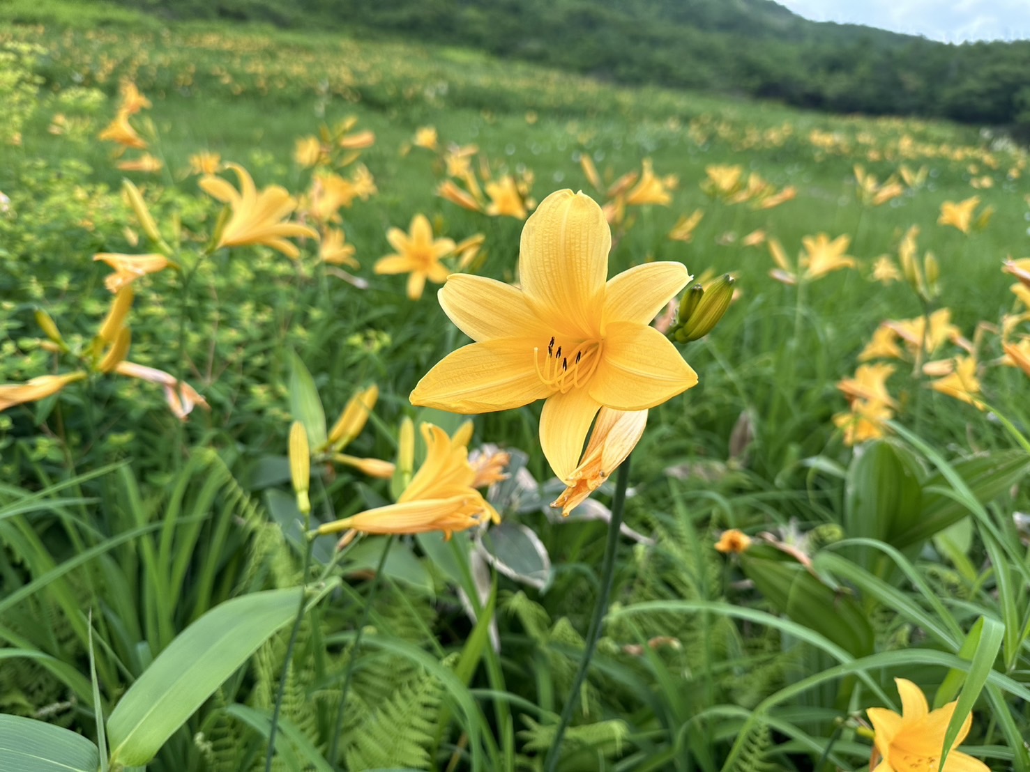 「ニッコウキスゲ」は夏の高原を代表する花のひとつ。鮮やかな黄色の花を一日だけ咲かせ、翌日にはしぼむ一日花として知られています。初夏から盛夏にかけて群生地一面を明るく染め上げ、その美しさは尾瀬や霧ヶ峰、車山高原などで人気の観光資源となっています。爽やかな風に揺れる花畑は、訪れる人々に夏の訪れを感じさせる絶景です。