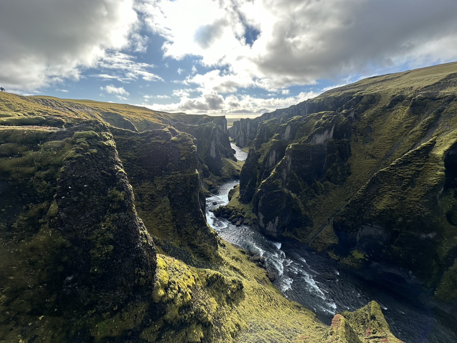 アイスランド南部に位置するフィヤドラルグリューフル渓谷は、 約200万年前の氷河期に形成されたといわれる壮大な峡谷です。 フィヤドラ川が長い年月をかけて玄武岩の大地を削り取り、深さ100メートル、長さ約2キロの峡谷をつくり上げました。 谷を覆う苔の緑と、渓流の青が織りなすコントラストは息をのむ美しさ。 上から眺めるもよし、遊歩道を歩きながら谷底をのぞき込むもよし。 まるで大地そのものが生きているかのような迫力を感じられる、アイスランド屈指の自然美スポットです。